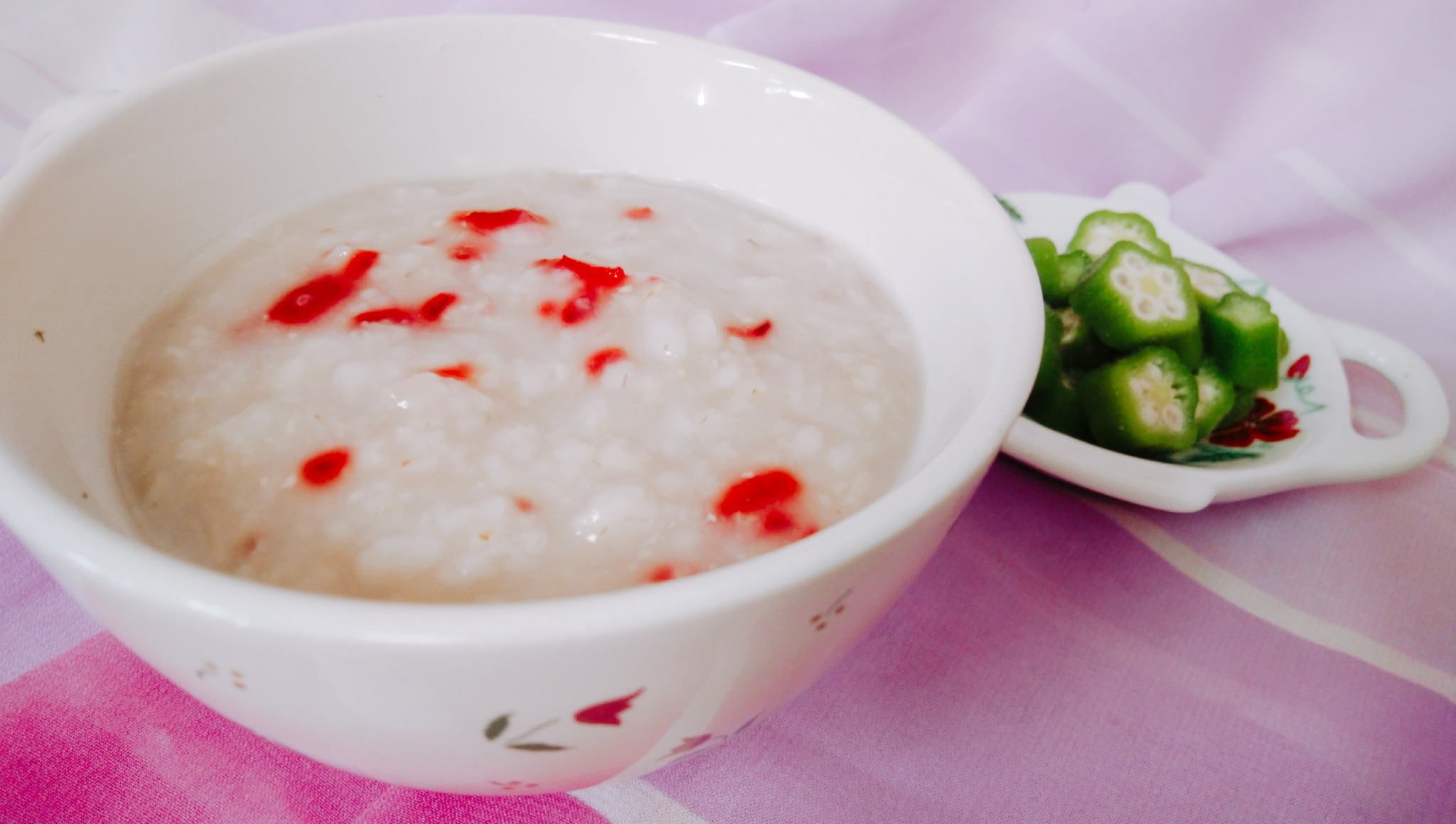 朝食のオートミールをローゼルの塩漬けで味つけ。